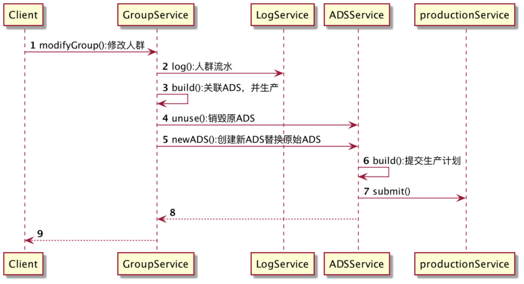 在分群服务的modify方法中,需要同时修改ADS定义,并提交生产任务,用户界面上需要即时反馈是否修改成功,任务是否提交,因此是强一致性的,此外,由于分群与ADS天生具有用户-聚合亲和度属性,一个ADS只被一个分群聚合实例持有,一个生产实例只被一个ADS聚合实例持有,因此可以使用同步事务。Log子域级别较低,不做事务处理。