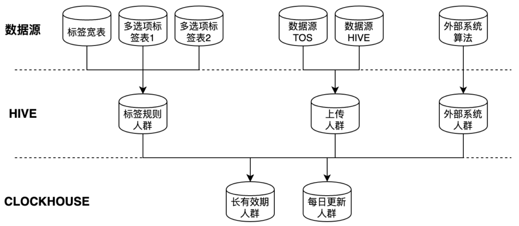 - 混合:离线人群+实时人群,根据与或非的逻辑,生成的新人群。离线部分时效性通常为T-1,实时部分时效性通常为秒级。