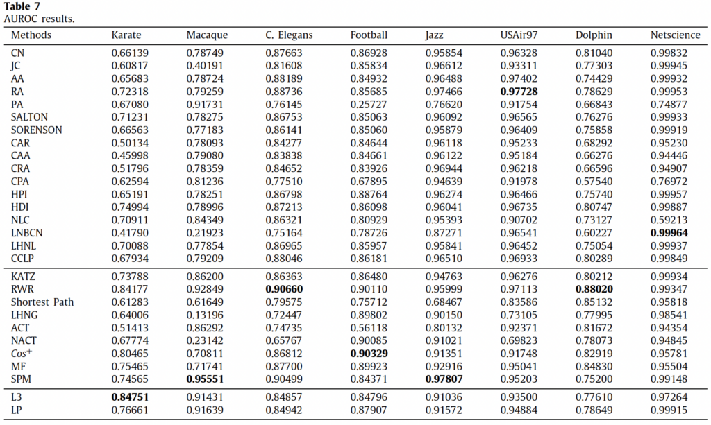 作者广泛研究了现有的链接预测方法,并将其分为基于相似性的方法、概率和最大似然模型、降维等。预测的准确性经过了广泛的测试。总体而言,RWR 的准确度最高。但在现实世界中,我们还应该考虑数据大小和算法复杂性,本文并未考虑这些因素。