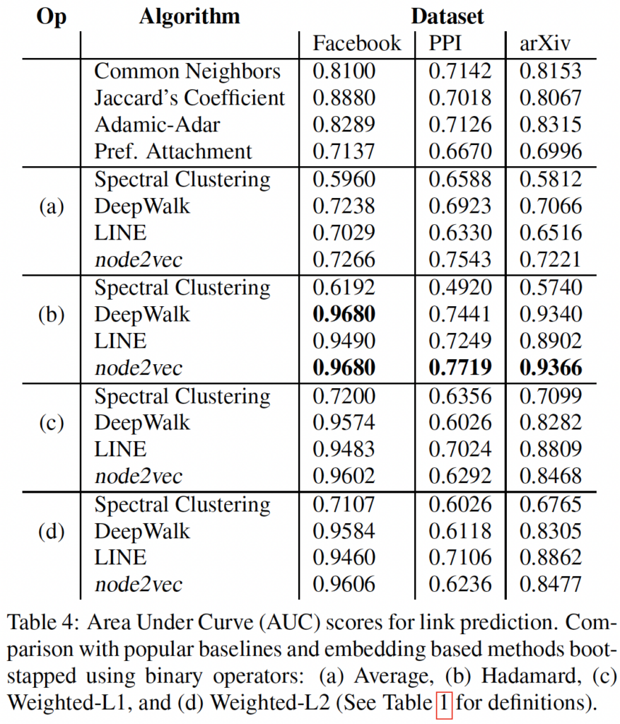 使用上面生成的向量来计算图中两个顶点之间的相似度。相似度越高,它们之间建立联系的可能性就越大。文中给出了向量的多种相似度计算:
