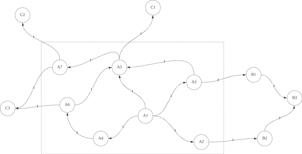 以用户为例,图中的每一个顶点代表一个用户,用户与用户间的有向加权边代表用户间的直接关联关系。我们需要获取与用户 A1 与其他用户之间的关联关系,并将其量化。